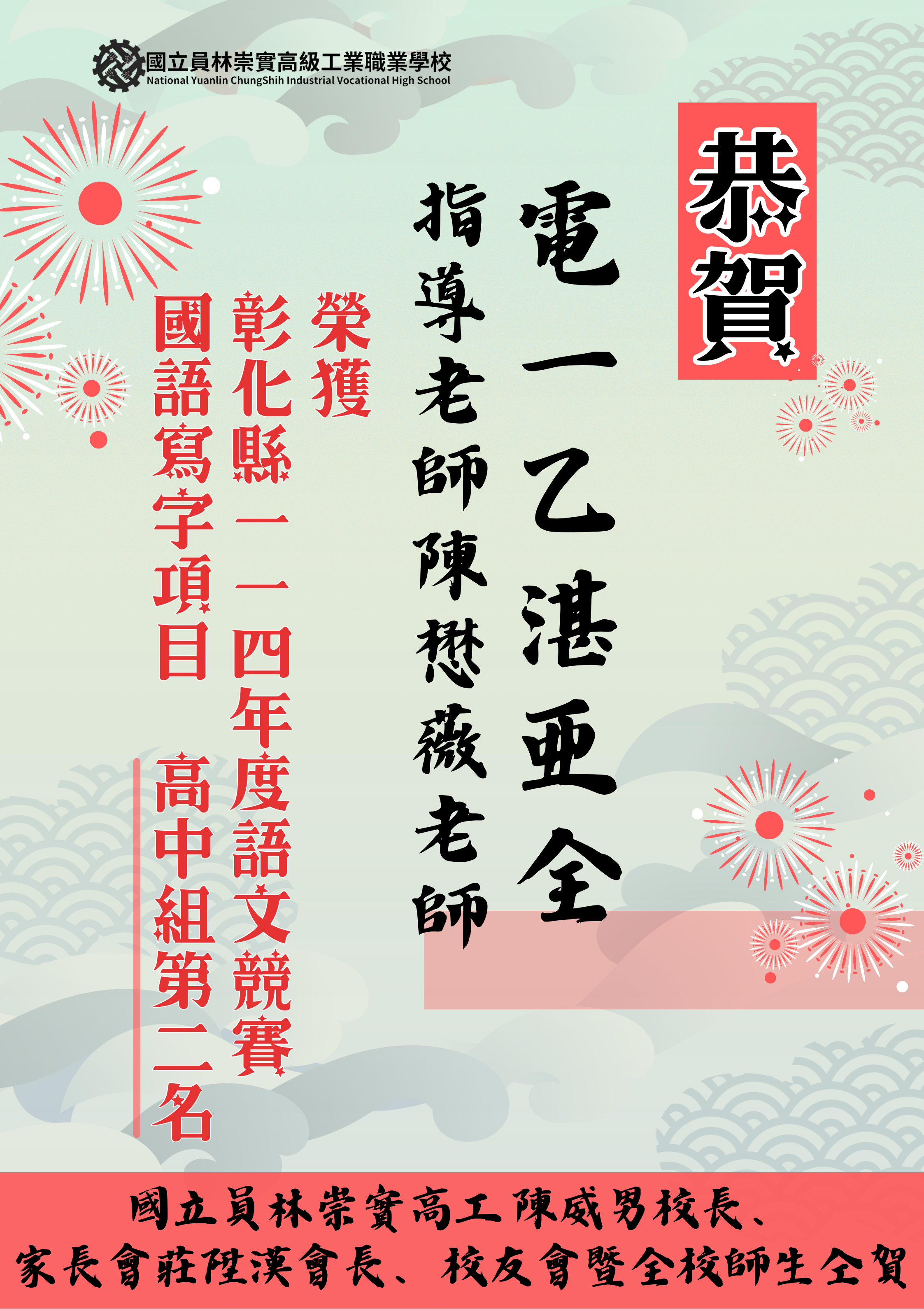 恭賀本校電一乙湛亜全榮獲 彰化縣114年度語文競賽-國語寫字項目高中組第2名,指導老師陳懋薇老師。
